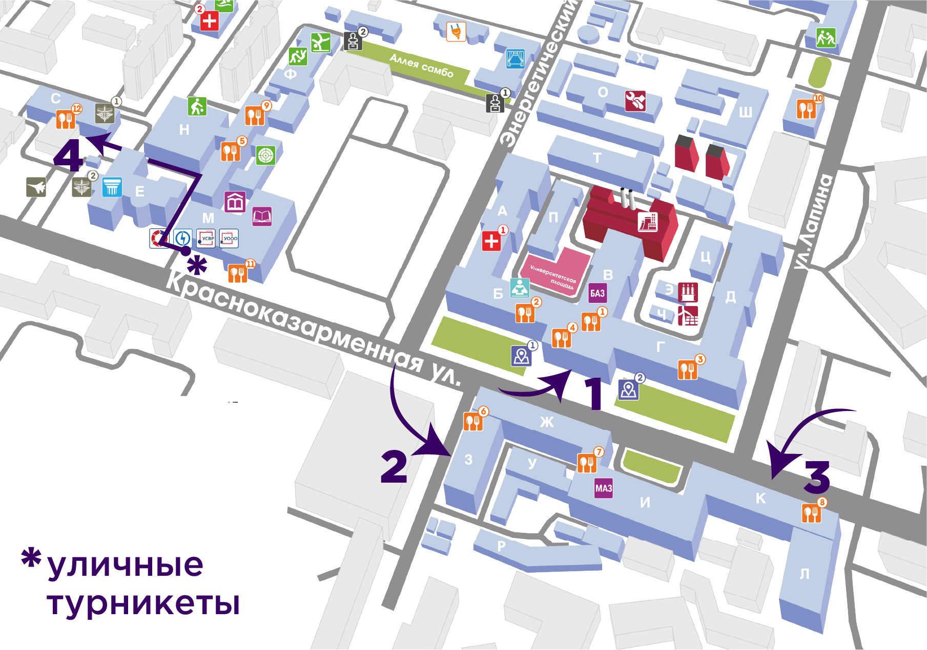 Вход в корпуса «К» и «Л» осуществляется по адресу: Красноказарменная улица, дом 14. Цифра 3 на карте.
